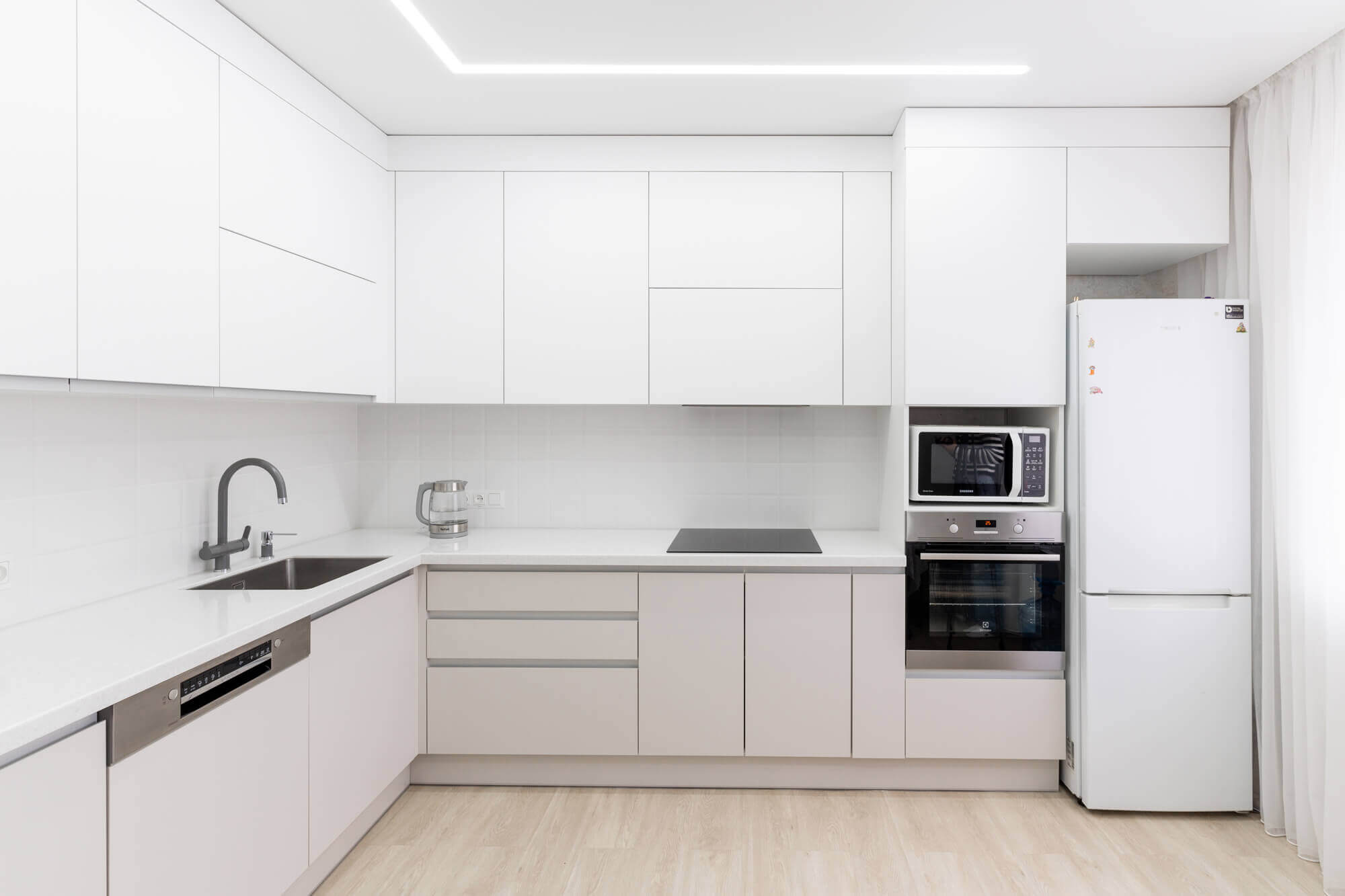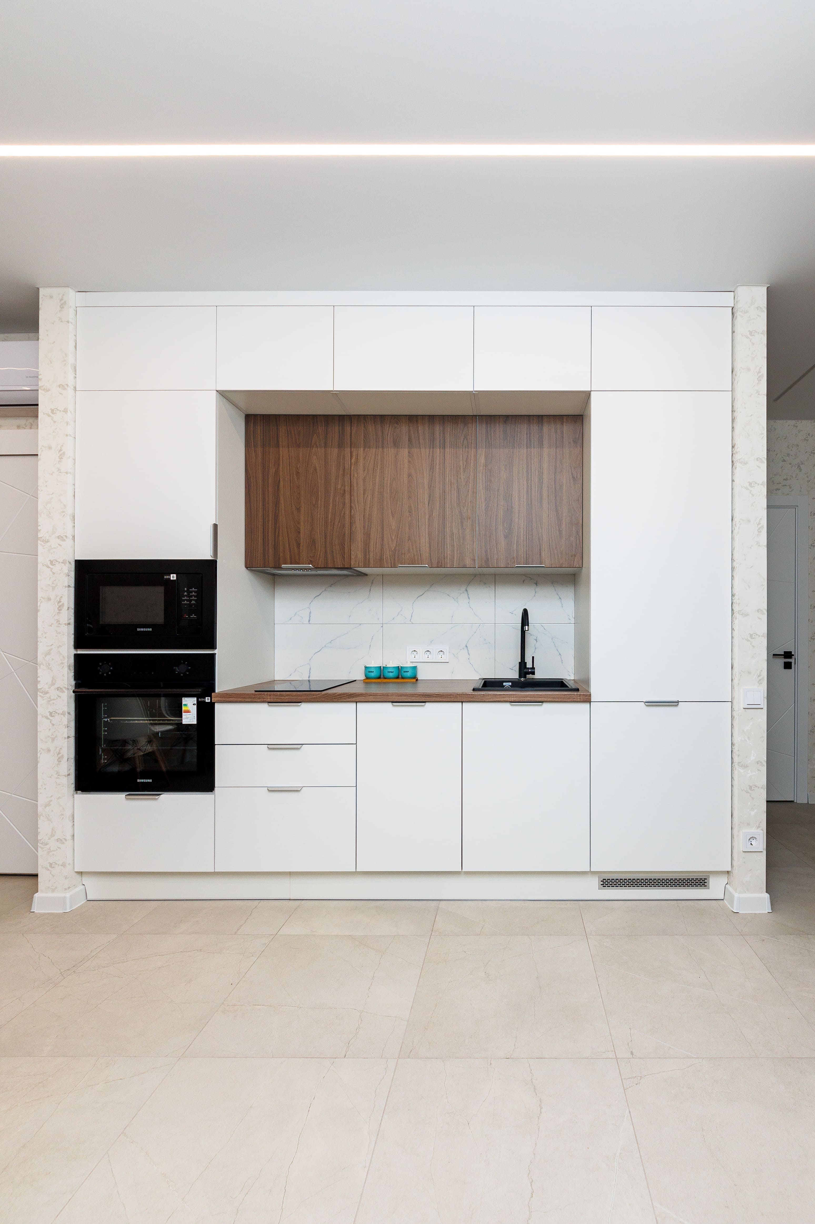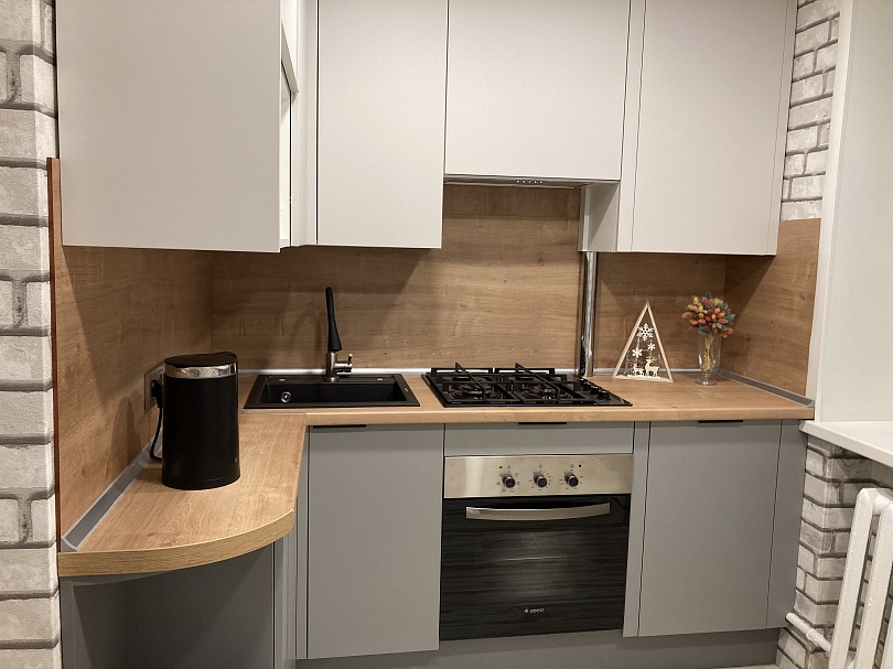 Кухня поставляется со всем необходимым, включая столешницу. Дополнительно подберем бытовую технику и сантехнику.