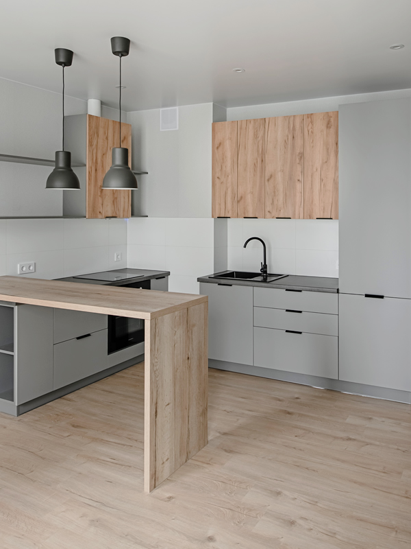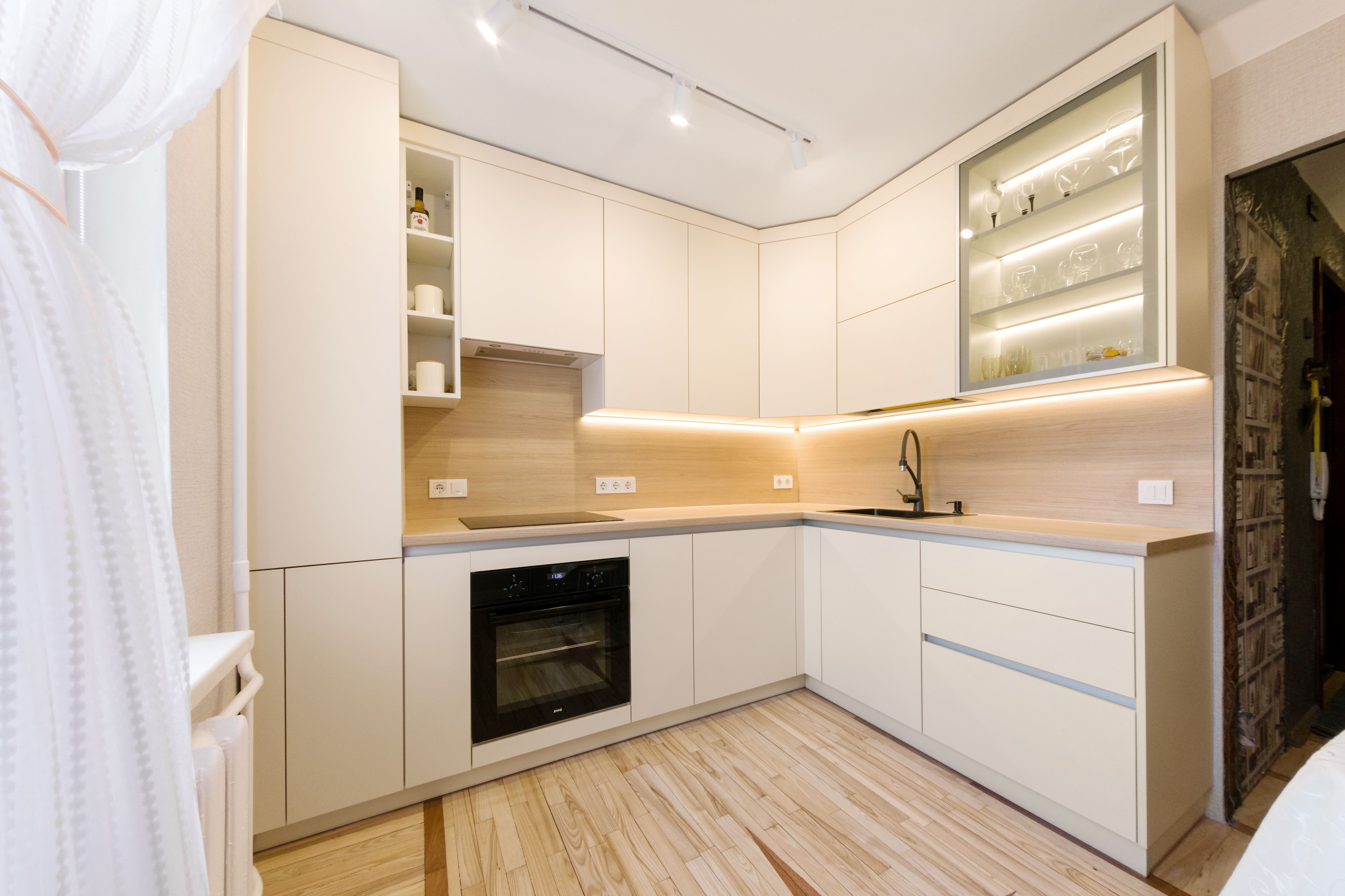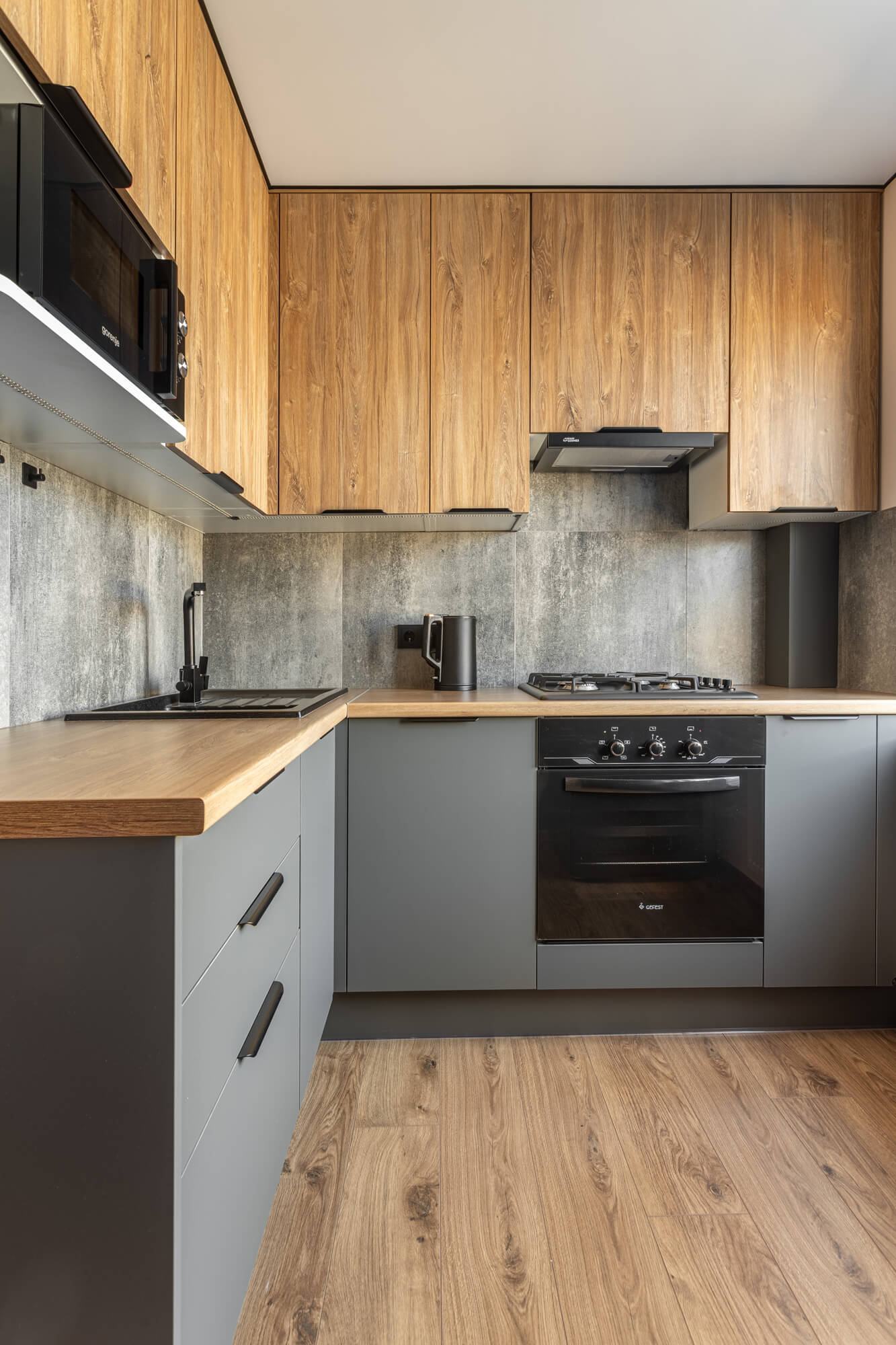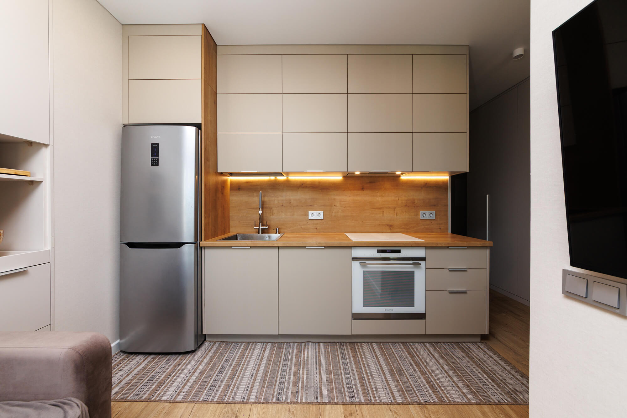Кухня поставляется со всем необходимым, включая столешницу. Дополнительно подберем бытовую технику и сантехнику.